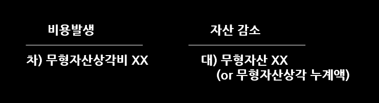 무형자산의 상각시에는 무형자산 상각비용 계정의 대변 계정으로 무형자산상각 누계액 계정을 설정할 수도 있고, 유형자산의 감가상각과는 달리 무형자산상각 누계액 계정을 설정하지 않고 무형자산 계정에서 직접 차감할 수도 있다.