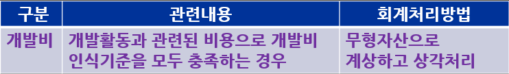 위에서 언급한 무형자산의 3가지 인식 기준을 모두 충족하면 개발비로 계상하고 개발비 인식기준을 충족하지 못하는 경우에는 제조원가나 판매비와 관리비로 비용 처리한다.